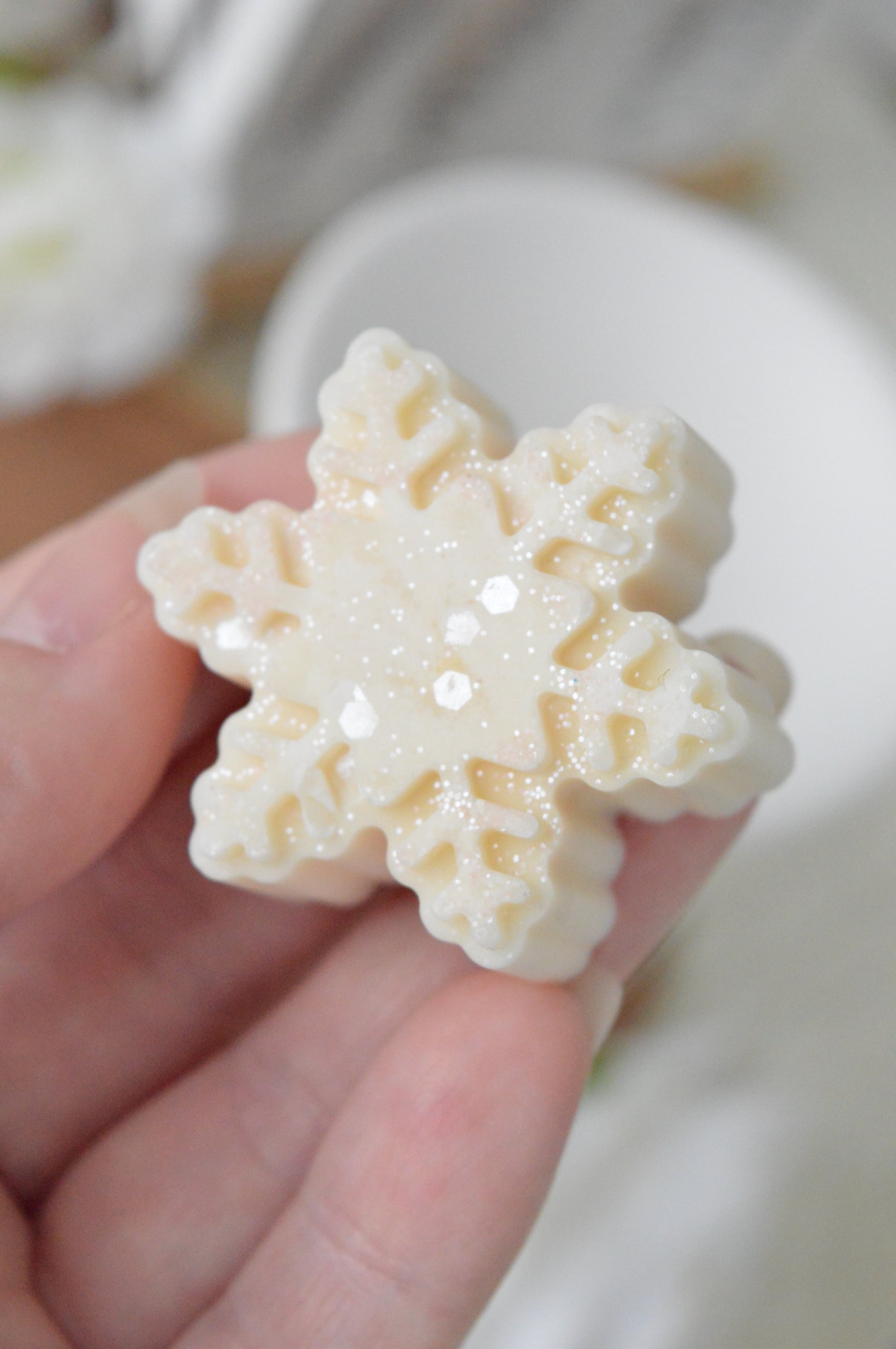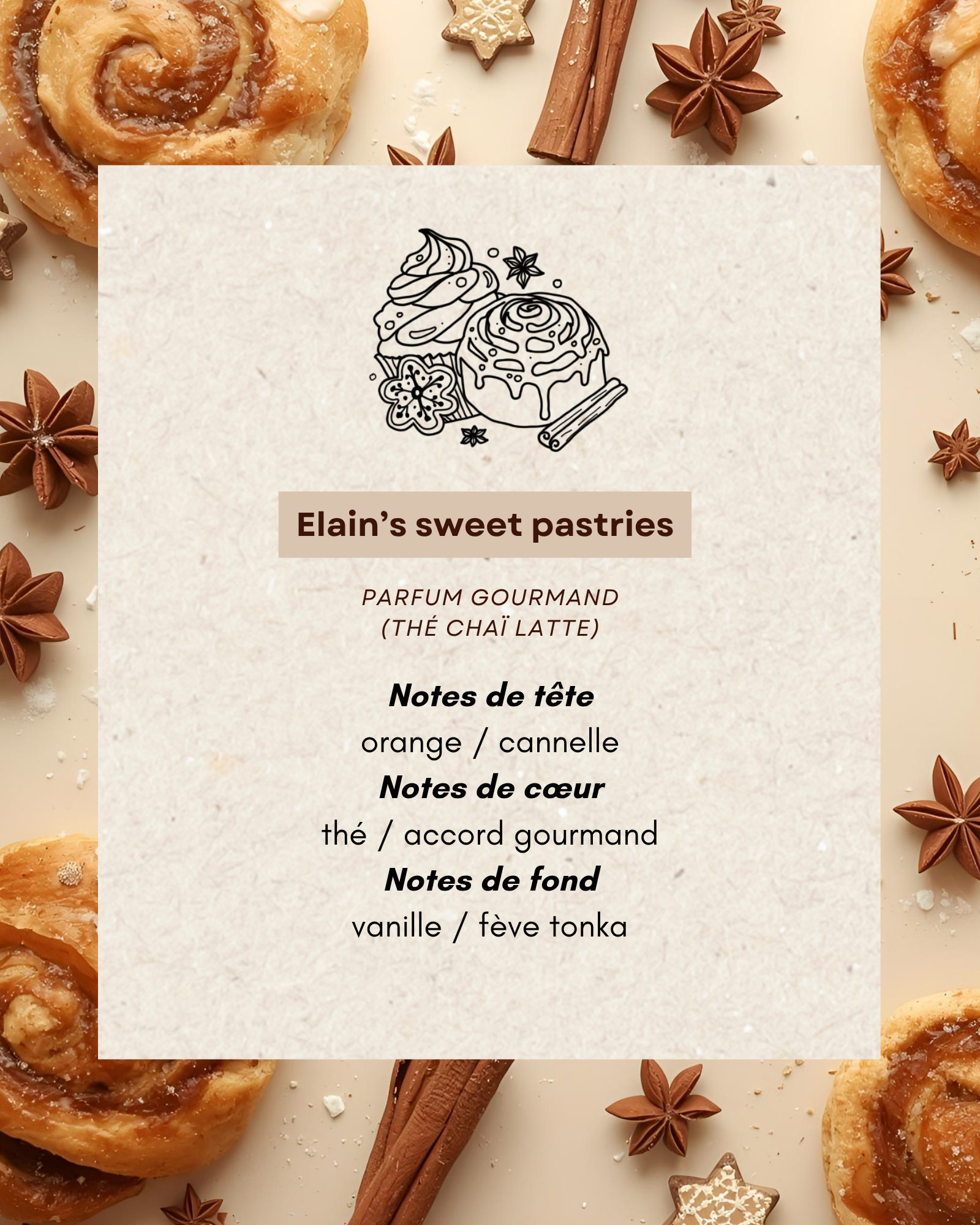 Description : 1 fondant parfumé individuel avec parfum de Grasse, en cire de soja, sans CMR et sans Phtalates. Tons crèmes et blancs avec paillettes biodégradables, sans plastique. Fragrance Elain's Sweet Pastries (Thé chaï latte, notes gourmandes et épicées). Le fondant est réalisé par mes soins en France. Notes de tête : orange et cannelle / Notes de cœur : thé et accord gourmand / Notes de fond : vanille et fève tonka.