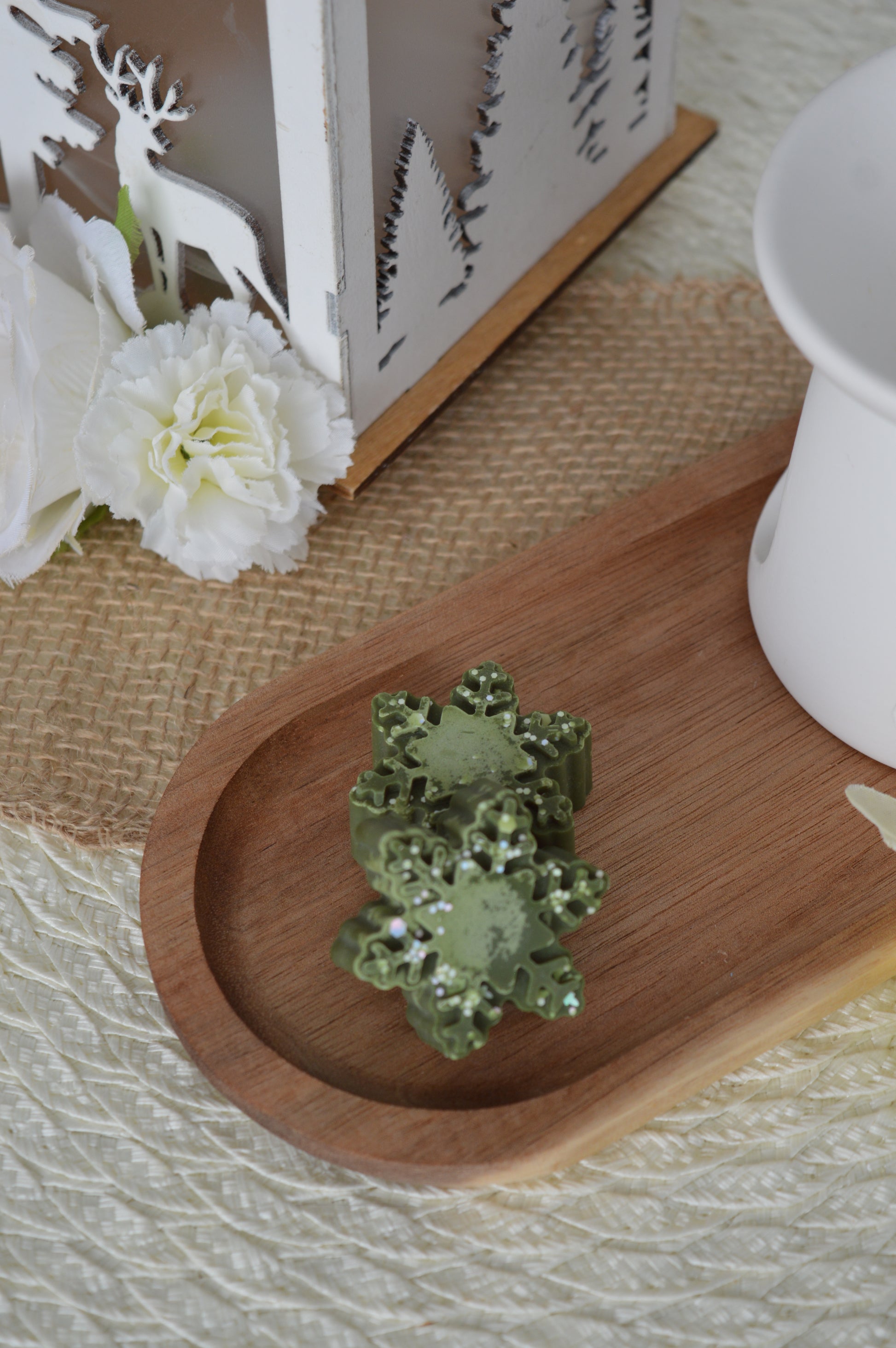 Description : 1 fondant parfumé individuel avec parfum de Grasse, en cire de soja, sans CMR et sans Phtalates. Tons verts sapin avec paillettes biodégradables, sans plastique. Fragrance Winter Solstice (Sapin de Noël, notes aromatiques). Le fondant est réalisé par mes soins en France. Notes de tête : pin et pomme / Notes de cœur : sapin / Notes de fond : santal et mousse.